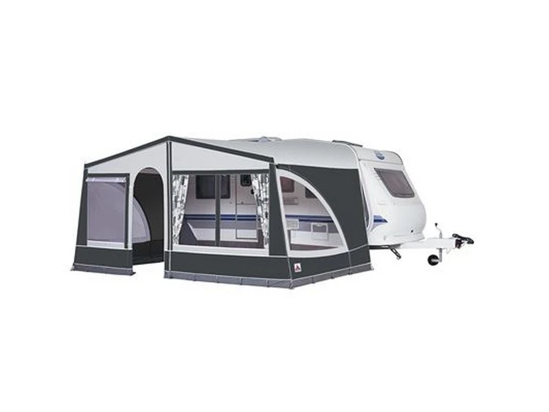 Speciaal voor de Panorama luifel heeft Doréma deze voorwand ontwikkeld die met kunststof haken aan het frame wordt bevestigd. In het midden is de voorwand voorzien van een rits, zodat de mogelijkheid bestaat één helft te verwijderen. Links van de deur bevindt zich een afsluitbaar gaasvenster. Deze voorwand is uitsluitend te gebruiken in combinatie met een luifelframe. Tegen meerprijs is een set gordijnen leverbaar. Bij bestelling altijd het modeljaar van de luifel vermelden.